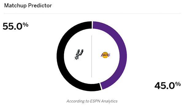 明日湖人主场大战马刺将是双方本赛季二次交手,去年11月16日湖人客场120-115险胜马刺,双方二番战,预计詹姆斯和浓眉都会带伤出战,对于本场比赛,ESPN预测湖人赢球概率为45%,马刺赢球概率为55%。