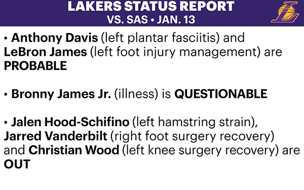 湖人官方已经公布本场比赛的伤病报告,詹姆斯(左脚伤病管理)和浓眉(左脚足底筋膜炎)都大概率出战,布朗尼(生病)出战成疑,席菲诺、范德比尔特和伍德都因伤继续休战。