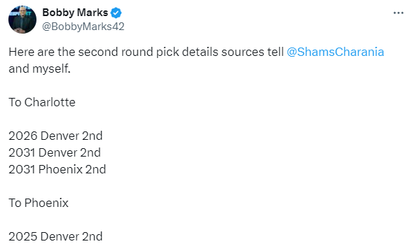 薪资专家Bobby Marks揭秘这笔4换2交易的细节,太阳付出的是自己2031年的次轮签、以及来自掘金的2026年和2031年两个次轮签,得到一个2025年的次轮签。