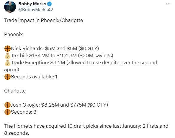 本赛季奥科吉的年薪为825万美元,理查兹年薪为500万美元,Bobby Marks表示,太阳在这一笔交易中获得一个价值320万美元的交易特例,太阳队奢侈税从1.842亿美元降至1.643亿美元,节省了2000万美元的奢侈税。