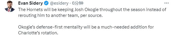 Evan Sidery报道,黄蜂将会把奥科吉留在球队中,不会把他交易到其他球队,奥科吉的防守心态和能力对于夏洛特的轮换来说是一个急需的补充;奥科吉本赛季为太阳出战25场,场均出战14分钟,可以得到6分2.9篮板0.6助攻。