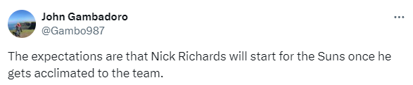 太阳看重理查兹的运动能力、防守以及篮板能力,太阳随队记者John Gambadoro进一步报道,一旦理查兹适应球队,预计他将会成为太阳的首发中锋。