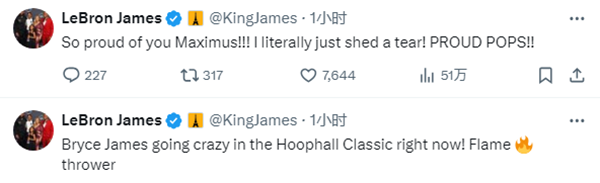 看到布莱斯的表现,40岁的老父亲激动发推,先是发推写道:布莱斯在Hoophall经典赛中杀疯啦,火热滚烫;之后又发推写道:为你感到骄傲,马克西姆斯(注:布莱斯的中间名)!!!我真的落泪了!骄傲的老爸!!