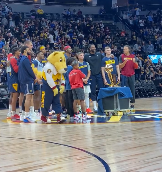 训练赛结束之后,掘金队把总冠军奖杯搬到球场上,再次与球迷一起庆祝夺冠;全队与奥布莱恩杯合影,戈登全程跳舞十分兴奋;这是掘金队史首冠,上赛季约基奇、穆雷和戈登带队成为NBA最大赢家,约基奇更是夺得总决赛MVP。