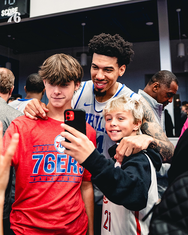 76人官方晒出蓝白对抗赛现场照,贝弗利认真执教梅尔顿队,恩比德与现场的球迷互动以及和梅尔顿队合影,塔克咧嘴大笑相当开心,丹尼-格林与球迷合影。