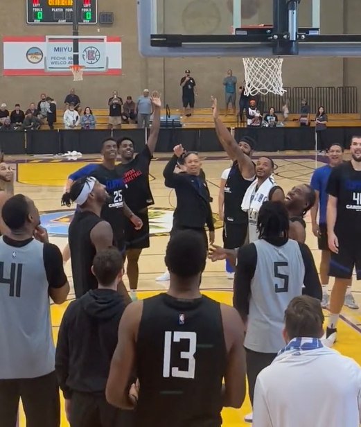 卢指导罚球时,快船所有球员都想尽办法干扰泰伦-卢,现场有人扔球衣成功干扰卢指导罚球,小卡大笑乐开怀;不过卢指导表示这一次不算,快船众将继续干扰,最终卢把球罚进;卢指导赢了,全员立即接受惩罚进行折返跑。