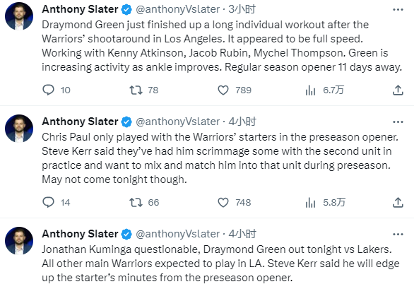 勇士今天将在洛杉矶对阵湖人,据勇士记者Anthony Slater报道,库明加因拇指伤势出战成疑,格林因脚踝伤势继续缺席比赛,其余主力球员都会出战。