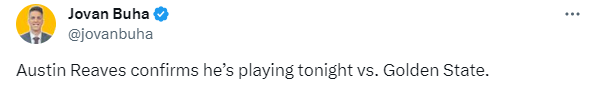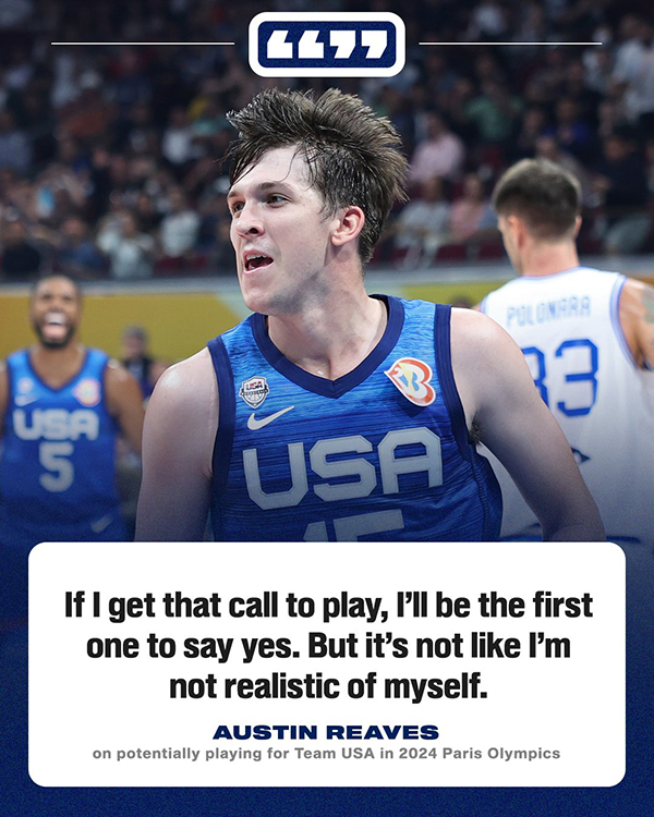 据Jovan Buha报道,里夫斯已经确定会出战本场比赛,他还表态希望为美国男篮出战巴黎奥运会,里夫斯表示:我知道都有些什么家伙想要打奥运会,我如果接到邀请电话,我会毫不犹豫的说‘YES!’,但这对我来说并不是不现实的。