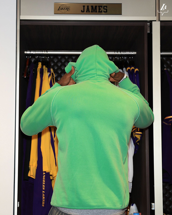 湖人官方还晒出詹姆斯的更衣室照,配文写道:主场;詹姆斯身穿绿色连帽卫衣,站在自己的更衣柜前更换球衣。