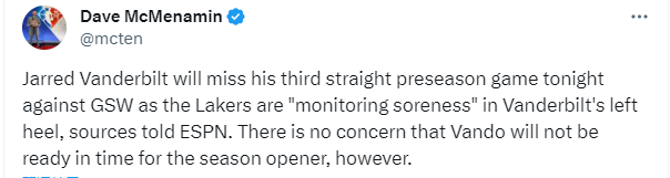 据名记Dave McMenamin报道,范德比尔特将继续缺席今天的比赛,这是他连续缺席的第三场比赛,湖人正在监测其左脚跟的酸痛情况。不过该记者也表示,不用担心范德比尔特的伤势会影响赛季揭幕战。