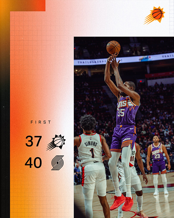 第二节,杜兰特续上火力,反击双手暴扣,迎着艾顿干拔命中,之后再次中投得分;杜兰特和布克无私传球为队友创造得分机会,打着打着,杜兰特外线开火命中三分,太阳反击杜兰特助攻利特尔上篮,太阳攻防两端都上强度,杜兰特再中三分,布克轰进压哨三分,太阳打出23-2的超级攻势瞬间拉开分差,这进攻火力太强了;太阳第二节39-15打爆开拓者,半场打完太阳76-55领先21分。