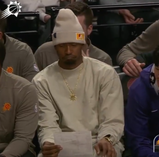 看到太阳队疯狂的进攻,比尔坐在替补席看数据统计表时露出惊讶的表情;下半场,太阳换上纯替补阵容,杜兰特、布克、戈登和努尔基奇都提前打卡下班。