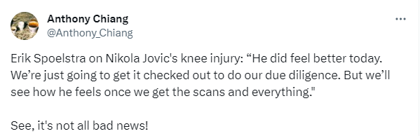 另外,约维奇的伤势也更新了, 他今天去医院接受了检查;热火记者Anthony Chiang报道,主帅斯波尔斯特拉更新约维奇的膝伤,斯帅表示:他目前确实已经感觉好多了,我们要做的就是对他的伤情进行尽责的检查。一旦我们得到所有信息,我们还会看看他自己的感受。