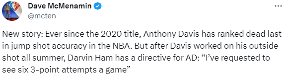 湖人今日训练结束之后,湖人主帅哈姆表示:“我想要他(浓眉),如果他能的话——我知道他不会这么做,但也许他会让我震惊——但我要求他每场比赛投六个三分球,至少每半场三个。如果我认为他没有这能力,我不会把这件事强加给他。”