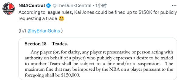 琼斯的一系列疯狂言论引热议,黄蜂队介入调查,黄蜂主帅克利福德曾表示球队已经了解到琼斯的言论,将内部处理此事;9天前,黄蜂官方宣布琼斯因个人原因离队,归期未定;如今琼斯正式宣布他已经申请离队,据美媒报道,他可能因申请离队面临最高15万美元的罚款。