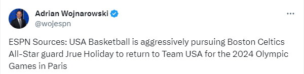 美国男篮正在积极争取凯尔特人后卫霍勒迪加入球队参加奥运会,虽然霍勒迪还没有做出决定,但格兰特-希尔等美国男篮管理层都希望霍勒迪能成为明年美国男篮征战巴黎奥运的12名球员之一。
