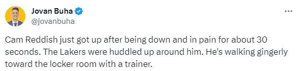 第四节还剩10分多钟,雷迪什在一次防守时不慎崴脚,右脚扭了一下,痛苦倒地双手抱头,湖人主动喊暂停,之后詹姆斯等球员都围过来,十分担忧雷迪什的身体;雷迪什换了一会后缓缓地站起来,之后与湖人工作人员一起返回更衣室,雷迪什走路有些颠簸。