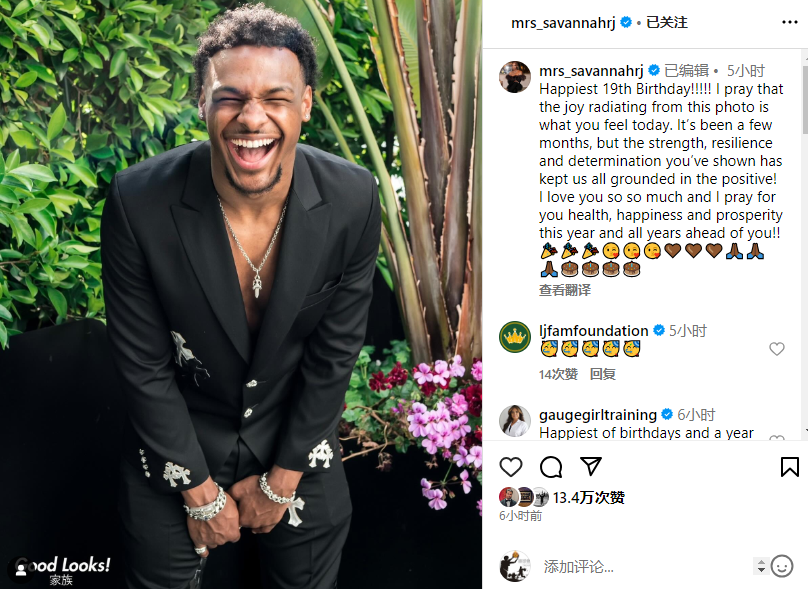 萨瓦娜晒布朗尼帅照,配文写道:19岁生日快乐!我祈祷从这张照片中散发出来的喜悦就是你今天的感受。几个月过去了,但你表现出的力量、韧性和决心让我们都保持了积极的心态!我太爱你了,我为你今年和未来的岁月祈祷健康、幸福和繁荣!