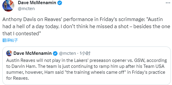 哈姆表示,由于里夫斯在今夏参加了世界杯,球队正密切关注他的恢复状况,会控制其出场时间,所以他将缺席明日对阵勇士的季前赛。