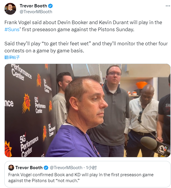 太阳全队结束训练之后,沃格尔公开表示杜兰特和布克都会出战新赛季的第一场季前赛,他们都不会打太久;此举是为了让他们适应比赛,计划让每个人都上场,并且会驻场监控他们在其他比赛中的状态。