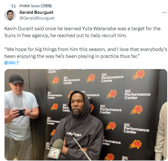接受采访时,杜兰特透露他亲自招募了渡边雄太,表示:我们希望他这个赛季能取得伟大的成就,我很高兴每个人都喜欢他迄今为止在训练中的表现。