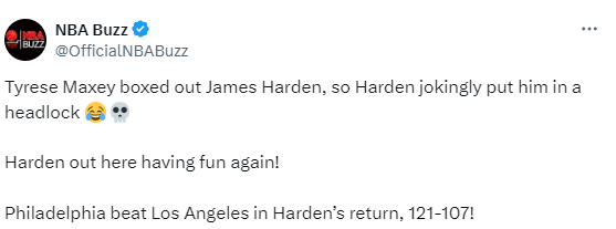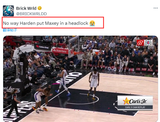比赛期间,哈登和马克西卡位抢篮板,哈登开玩笑锁喉昔日小弟,如此一幕引热议,美媒表示马克西把哈登打得落花流水,所以哈登开玩笑锁喉马克西;美记者表示哈登不可能让马克西陷入困境。