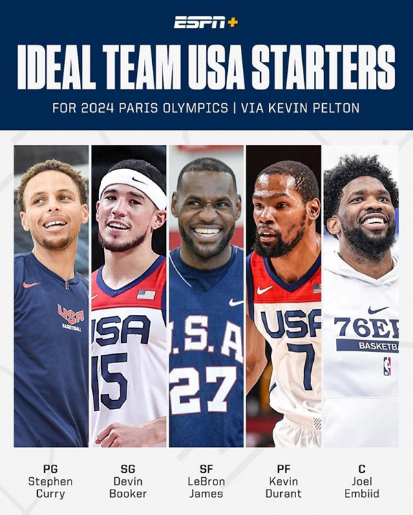 恩比德承诺为美国男篮效力引热议,美媒预测美国男篮巴黎奥运会的首发阵容——詹姆斯、库里、布克、杜兰特和恩比德。