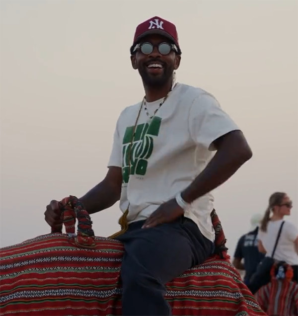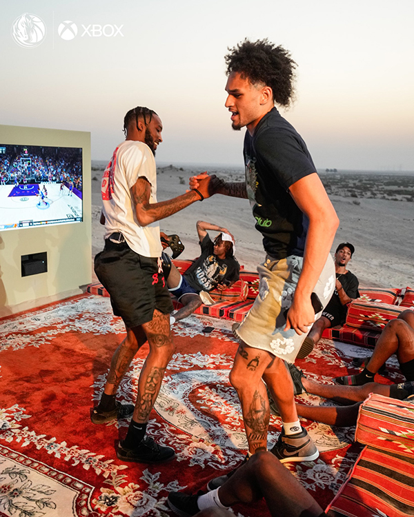 欧文在沙漠中戴着墨镜体验骑骆驼,满脸笑容十分开心;独行侠众球员享受沙漠晚霞,还在夜幕下坐在地毯上玩2K游戏,东契奇端着美酒观看,整个人十分放松。