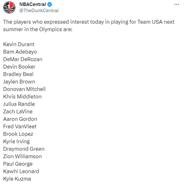 到目前为止,已经有21名球星表态想为美国队出战奥运,詹杜库领衔表态;值得一提的是,浓眉不确定是否出战巴黎奥运会。