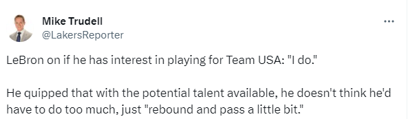 在湖人媒体日上,谈到是否愿意为美国男篮出战巴黎奥运会,詹姆斯表示:我愿意。我确实对征战巴黎有很大的兴趣。当然,这赛季我在湖人这里也有很多事要忙。但我确实很有兴趣代表美国男篮出战巴黎。众所周知,我有过为美国队出战的履历,我们美国这里也有很多优秀的球员。