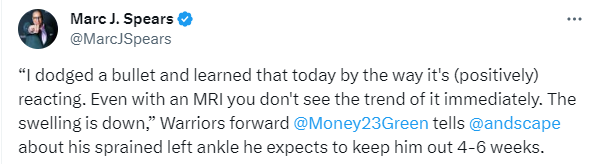 勇士队记Jason Dumas报道,勇士前锋追梦格林扭伤了左脚踝,并非高位脚踝扭伤,但可能需要三至六周的恢复时间。
