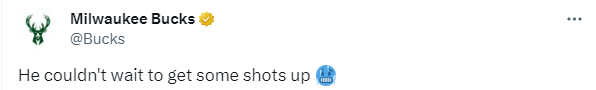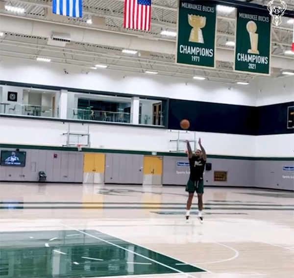 利拉德换上训练短裤、T恤和球鞋,在雄鹿训练球馆中训练,在22秒的视频中,利拉德连续命中4记三分球;值得一提的是,球馆上空挂着雄鹿队的两面总冠军旗帜,十分显眼。