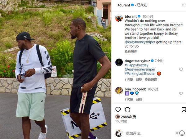 杜兰特的亲哥托尼-杜兰特晒兄弟两人的合影,配文写道:我们经历过苦难,但我们仍旧站在一起,兄弟生日快乐,我爱你,35号35岁了。