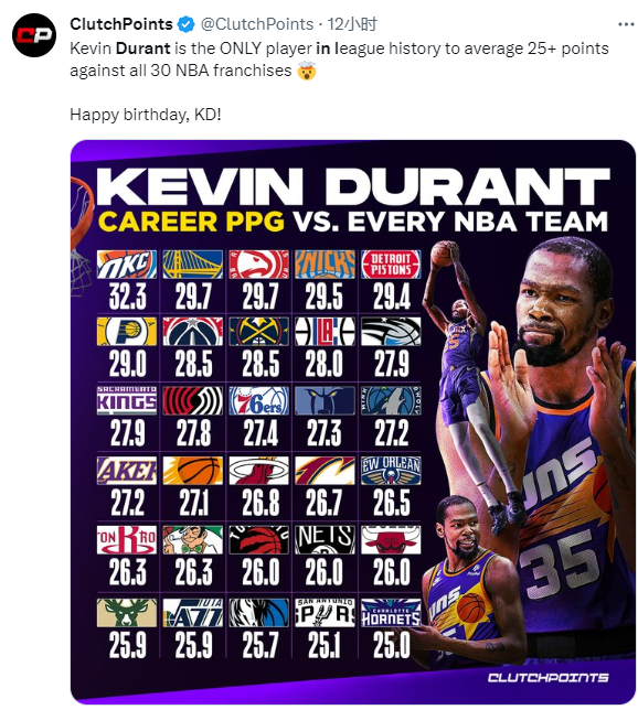 美媒ClutchPoint晒杜兰特创造的历史唯一纪录——杜兰特生涯对阵30支球队场均至少轰下25分,历史唯一;其中面对老东家雷霆,杜兰特更是场均狂砍32.3分。