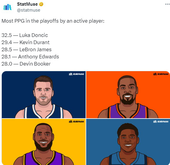 美媒Statmuse晒现役球员季后赛生涯场均得分排名——1. 卢卡-东契奇32.5分;2. 凯文-杜兰特29.4分;3. 勒布朗-詹姆斯28.5分;4. 安东尼-爱德华兹28.1分;5. 德文-布克28.0分。