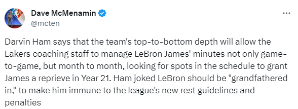 哈姆随后打趣道:我认为詹姆斯不应该受到联盟轮休新规的限制,他休息也不该受到处罚。