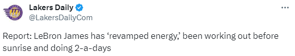 “我被告知,他的常规时间表是在日出之前开始训练。而在接近训练营开始的几周里,他在进行一日两练。勒布朗已经影响到的一位球员是八村垒,他也在改变自己临近开赛前的日程表,前往湖人训练馆与勒布朗见面,参加早上7点的训练。