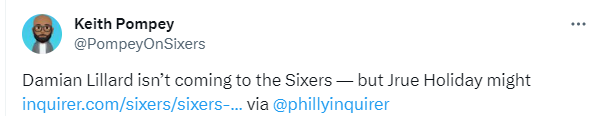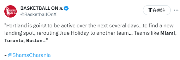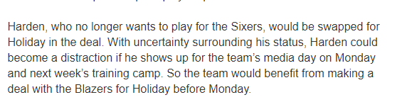 76人随队记者Keith Pompey跟进报道,利拉德不会加盟76人,但霍勒迪可能来;该记者还表示,76人一直坚持用哈登交换一名全明星球员,或者其他可以让他们得到全明星球员的资产,一位消息人士证实,76人对从开拓者手中得到霍勒迪很感兴趣。