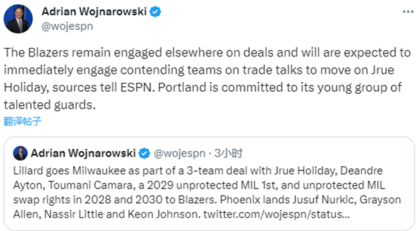 太阳、雄鹿和开拓者三方交易,其中利拉德被送往雄鹿,霍勒迪&艾顿被送往开拓者,努尔基奇被交易至太阳;据名记Woj后续报道,开拓者仍在与其他球队商讨交易,预计开拓者立即会与有竞争力的球队开展交易谈判,以送走霍勒迪。开拓者目前致力于培养队内的年轻后卫。