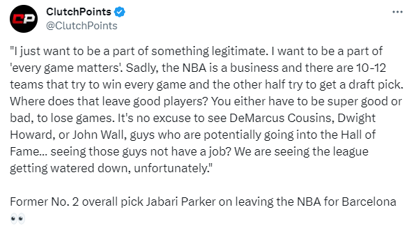 来源:24直播网09-27 14:3424直播网09月27日讯 近日巴萨男篮球员、2014年NBA榜眼贾巴里-帕克公开批评NBA,炮轰NBA摆烂成风,导致考辛斯霍华德这些名人堂候选者无球可打。