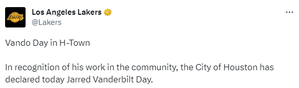 湖人官方晒出范德比尔特获得荣誉日的帅照,为了保障范德彪在社区中所做的工作,休斯顿已经正式把9月26日(当地时间)定位范德比尔特日。