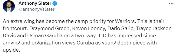 勇士跟队记者Anthony Slater跟进报道,目前勇士队训练营的首要目标是补充球队的侧翼,现有的前场球员名单——追梦格林、卢尼、萨里奇、加鲁巴和杰克逊-戴维斯,杰克逊-戴维斯作为新秀给勇士队留下了比较深刻的印象,勇士队也把加鲁巴视为年轻且有潜力的前场轮换。