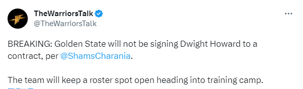 名记Shams报道,勇士不会在训练营前签约霍华德或者其他老将内线,勇士想要保持阵容名单的灵活性,以准备在训练营后或者常规赛期间能够灵活签约;接下来的几周,霍华德将会和其他感兴趣的球队进行联系,试图重返NBA。