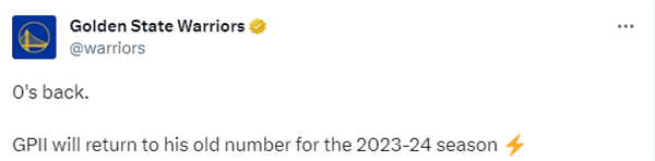 来源:24直播网09-22 15:5624直播网09月22日讯,勇士官方正式宣布,小佩顿新赛季将会穿回0号球衣,官推晒照并且写道:0号回归,小佩顿将在2023-24赛季穿回他的老号码。
