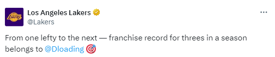 詹姆斯转发湖人官方的视频从而祝贺拉塞尔——在1995年4月23日,克-范-埃克塞尔创造湖人队史单赛季三分命中纪录(183记三分);2024年3月23日,詹姆斯助攻拉塞尔命中本赛季第184记三分球,超越克-范-埃克塞尔成为湖人队史单赛季三分王。