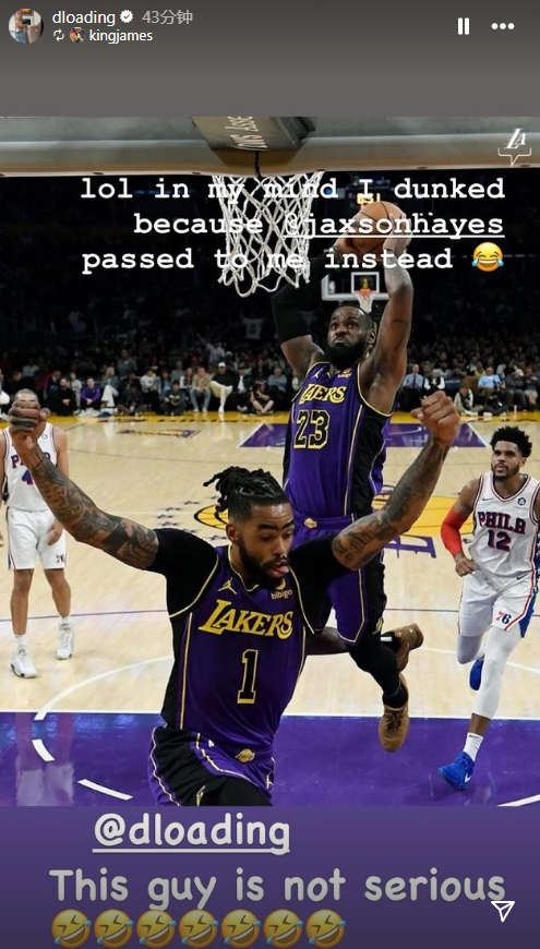 詹姆斯还晒出他与拉塞尔同框的热议画面——当时詹姆斯空接双手砸扣,拉塞尔兴奋起飞十分抢镜;老詹配文写道:这个家伙不是认真的(7个笑哭表情),拉塞尔转发并调侃:在我的脑海里,我跳起扣篮是因为海斯把球传给了我。