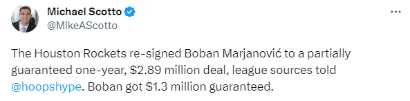 35岁博班1年合同重返火箭,合同细节曝光,据记者MichaelScotto报道,消息人士透露,他们双方签下一年价值289万美元的合同,其中130万美元受保障。