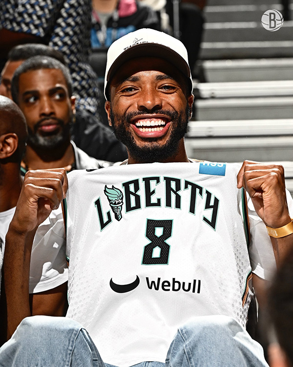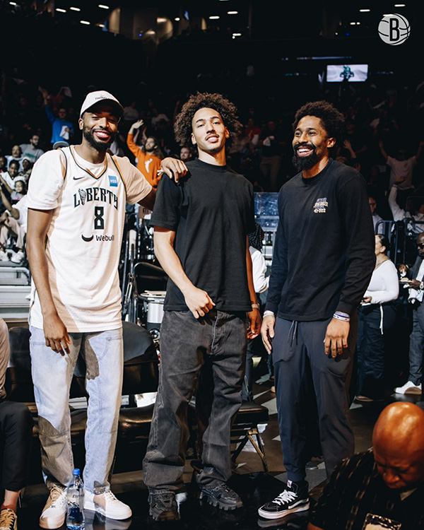 篮网官方晒出布里奇斯和丁威迪的观赛照,为自由人加油打球;其中布里奇斯身穿自由人8号球衣,坐在场边观战。