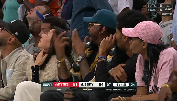 39岁的安东尼戴着棒球帽和墨镜来到现场,纽约自由人播放视频向他致敬,甜瓜点燃整座球馆,站起来向球迷挥手致意,全场响起热烈的掌声和欢呼声;加时赛关键时刻,安东尼不满判罚并且希望裁判回放,尽可能支持自由人获胜。