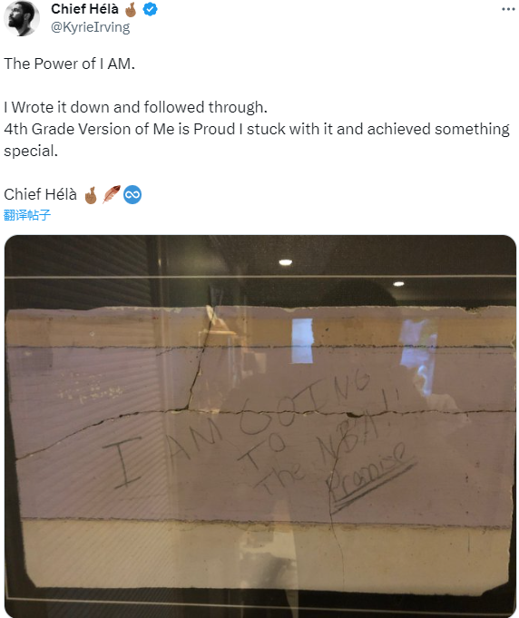 目前欧文正在中国行,期间他更新社交媒体,发推晒出一张自己4年级时的手稿,把自己的梦想刻在了墙壁上,配文写道:相信自己的力量,四年级的我把‘梦想’写了下来并坚持到底,我坚持了下来,取得了一些特别的成就。
